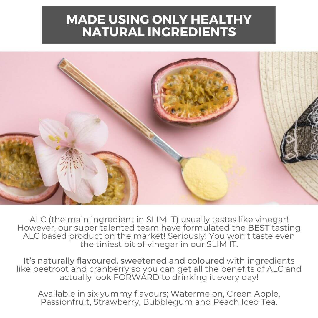 ALC usually tastes like vinegar! However, our super talented team have formulated the BEST tasting ALC on the market! Seriously! You won’t taste even the tiniest bit of vinegar in our SLIM IT. It’s naturally flavoured, sweetened and coloured with ingredients like beetroot and cranberry so you can get all the benefits of ALC and actually look FORWARD to drinking it every day!