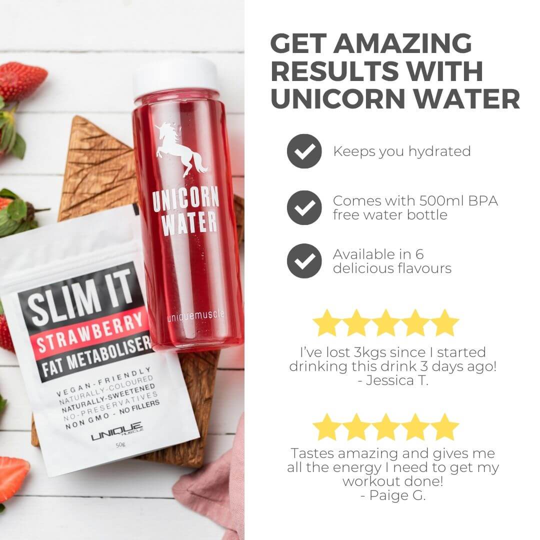 Feel like a majestic unicorn with our famous Unicorn Water Pack! This pack includes 1 x 50g pack (approx. 50 serves) of SLIM IT in your choice of flavour and 1 x 500ml BPA-FREE Clear Plastic Unicorn Water Bottle.