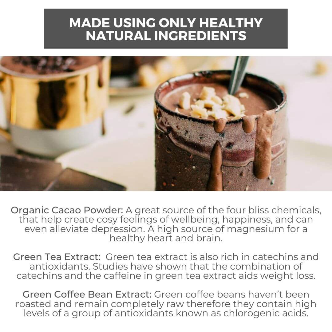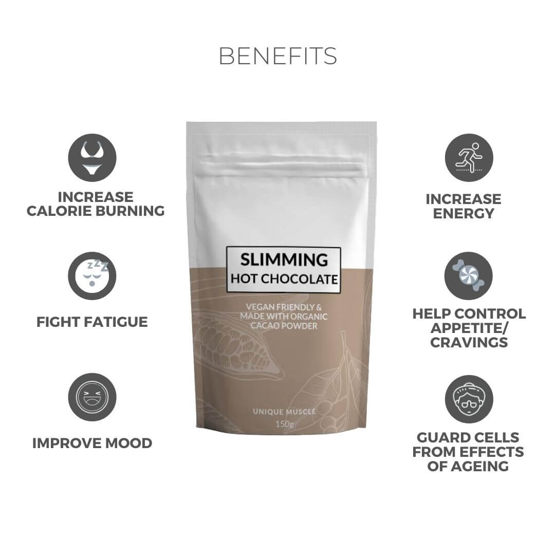 SLIMMING HOT CHOCOLATE is an instant style hot chocolate with a rich and creamy taste. What makes it better than your regular hot chocolate? Well, we’ve supercharged this blend with the added benefits of potent ingredients like organic cacao powder, green coffee bean and green tea extract!